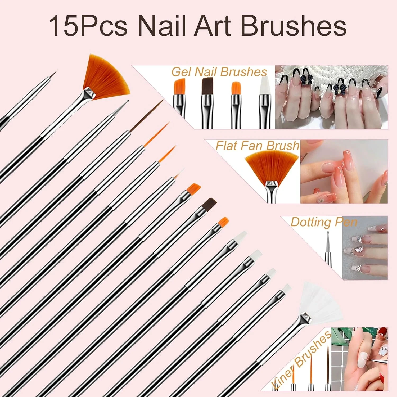 15 Multifunctional Pens: These are paintbrushes for nail art painting. They can be used to draw flowers, outline, paint, and create lines on nails.
